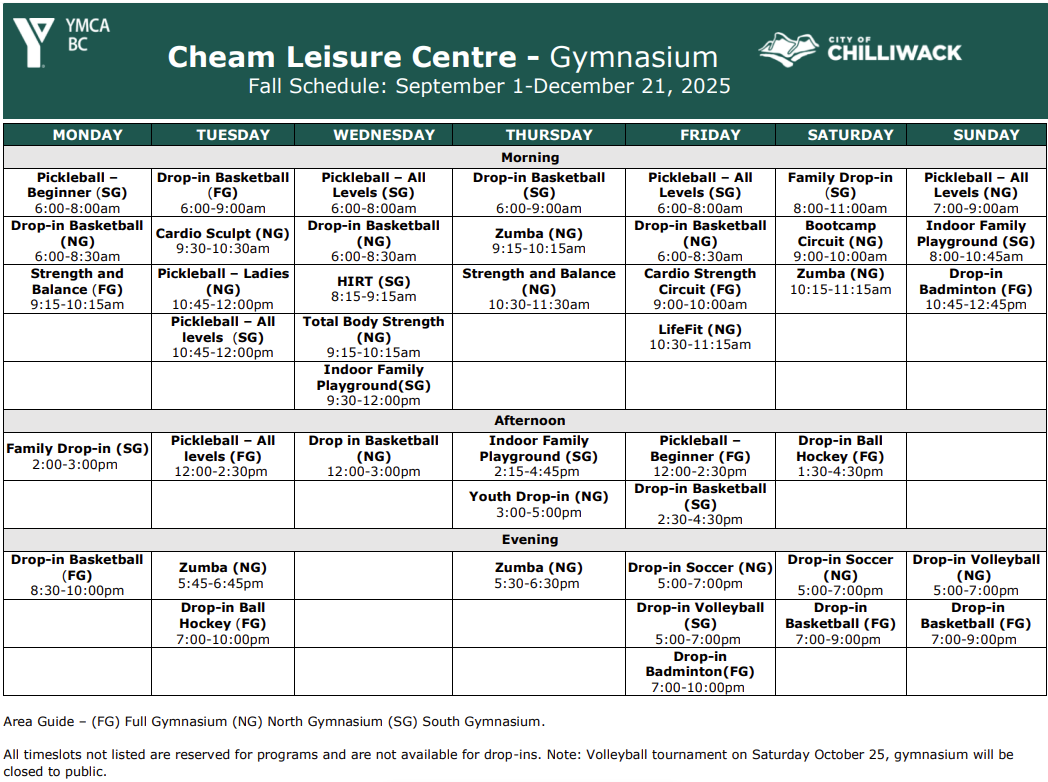 Cheam Fall Group Fitness Schedule (Sept. 1-Dec 21)